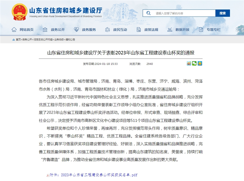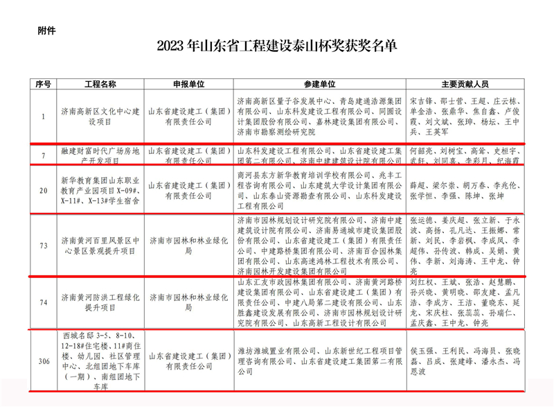 2024年元月18日,山東省住房和城鄉建設廳通報2023年“山東省工程建設泰山杯獎”獲獎名單,山東建工集團承建參建的6項工程榜上有名,標志著集團工程質量管理水平再上新高度。