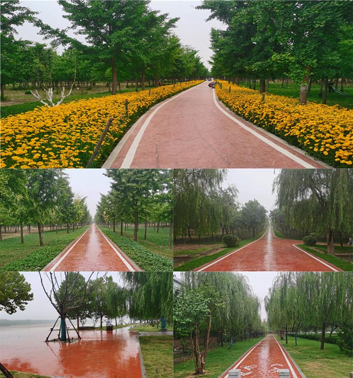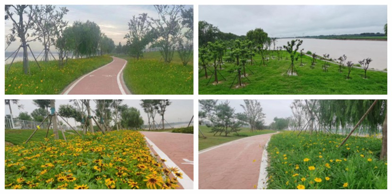 4.濟南黃河百里風景區中心景區景觀提升項目位于濟南市黃河南岸天橋區段,施工范圍涉及綠道、老徐莊險工(東段)、濼口上首節點、對應堤頂路兩側5米范圍內綠化養護,總計路長約4.07km。集團圍繞喬灌木栽植、地被栽植、休憩場地鋪裝、地平廣場壓印等任務進行施工,讓黃河百里風景區中心景區的景觀形象大幅提升、成為又一處可供居民休閑放松的綠色生態場所。